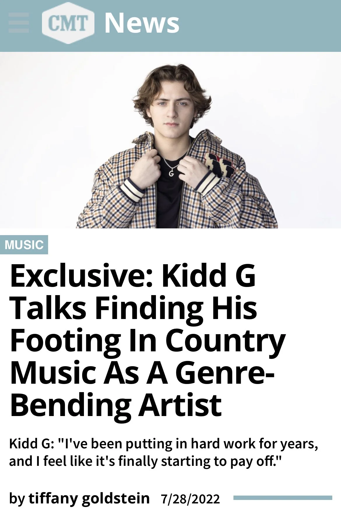 News, PressRyan DavisAugust 02, 2022Kidd G, CMT, Interview, Country Music, Genre Bending Kidd G Recently Sat Down To Chat With CMT About Finding His Footing In Country Music News, PressRyan DavisAugust 02, 2022Kidd G, CMT, Interview, Country Music, Genre Bending Ryan Davis Facebook0 Twitter Tumblr Pinterest0 0 Likes