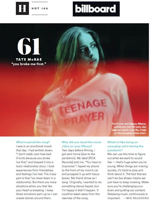 Check out Tate McRae’s Billboard’s Hot 100 Feature talking about what influenced her song “you broke me first”!